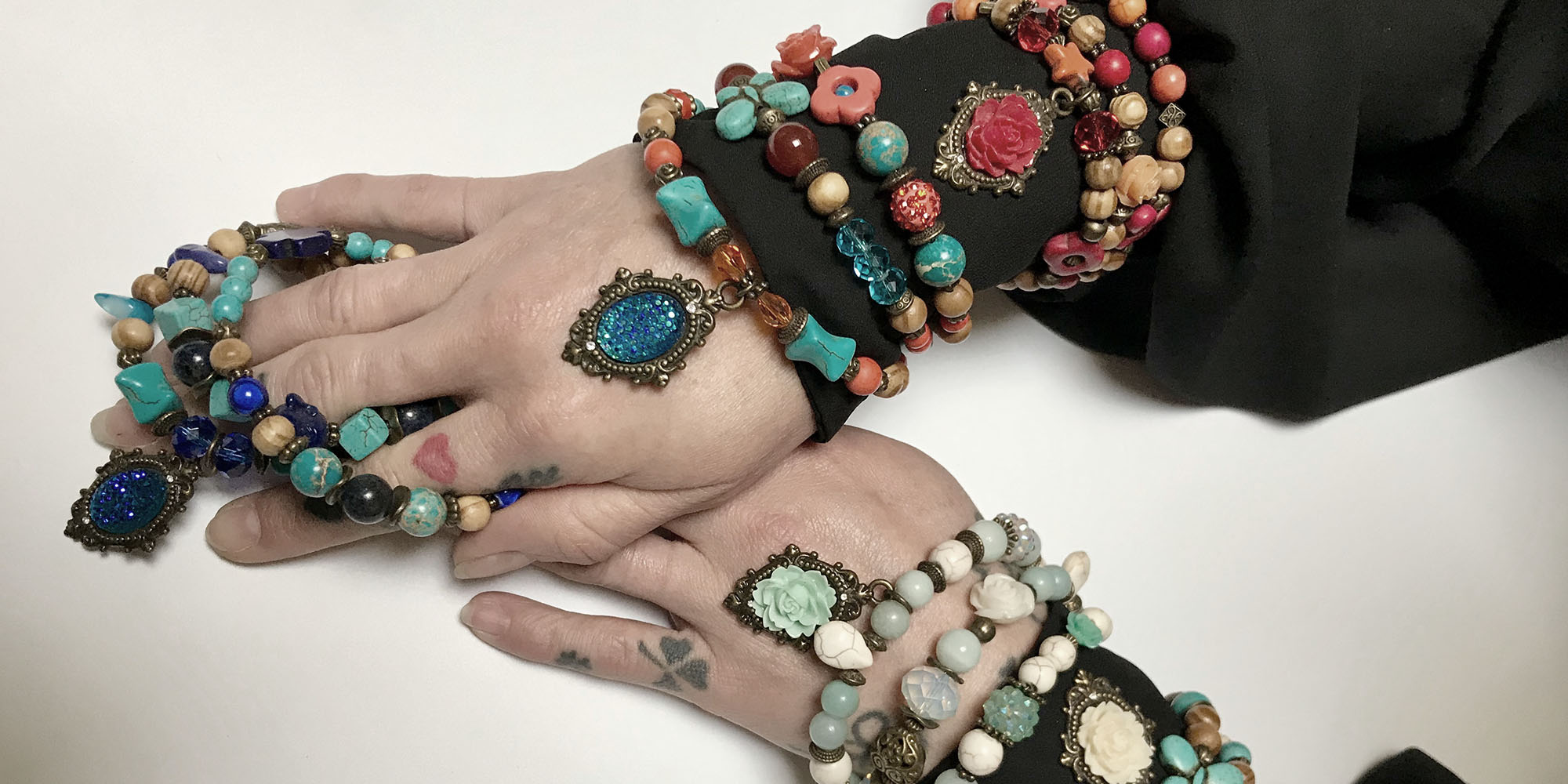Mes créations, que vous pouvez également découvrir en photos, se répartissent en plusieurs grandes collections à l’identité propre. La collection Anhui associe les perles et l’hématite pour créer un effet ultra chic par le contraste des couleurs blanche et noire et des reflets nacrés ou métalliques. De son côté, Ethnic Vibes travaille un aspect animiste aux coloris chaleureux, tandis que Gipsy Soul met en avant un style traditionnel bohémien.
